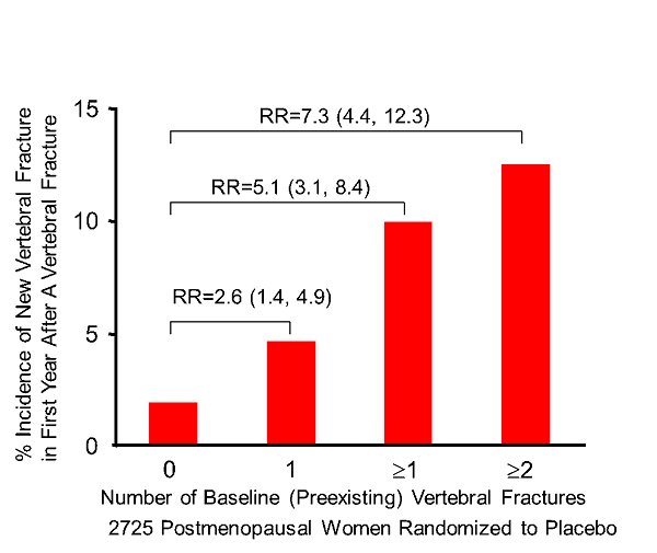 在基線時發生一處椎骨骨折導致在試驗的第一年內發生隨後骨折的風險增加2.​​6;具有1個或多個或2個或更多個基線椎骨骨折的風險分別增加57