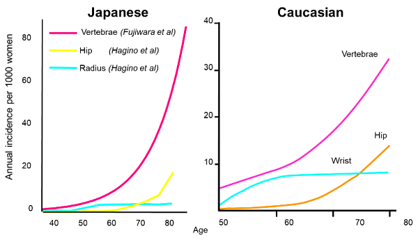 由左邊的Fujiwara博士報告的日本廣島和右側的Cyrus博士報告的高加索人群表明,椎體骨折是最常見的骨折,絕經後發生的時間早於髖骨骨折,並且隨著年齡繼續增加,不分種族。