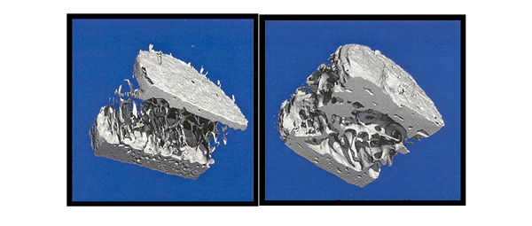 該圖顯示了使用20μgTPTD治療21個月的65歲女性的雙側髂嵴骨活檢的3DμCT重建。觀察到更多的板狀形態和皮質厚度的增加。在TPTD治療後,密度的中位數增加(TPTD,19% ; Placebo,14%)和皮質厚度的中位數增加(TPTD,22% ; Placebo 3%)被發現是顯著的(p = 0.05)(Jiang Y 2003)。