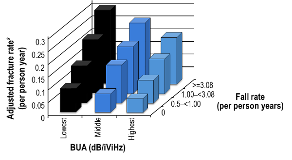 發現骨折率隨著跟骨骨超音波衰減(BUA,bone ultrasound attenuation)測量的減少而增加,該測量用於評估骨強度。