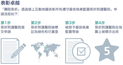 世界骨質疏鬆基金會所公佈的攔阻骨折藍圖(Capture the Fracture Framework, CFF),每一條評量的準則都分為一、二、三級,愈高級愈難達到,若大部分的準則都可以達到三級,可得到金牌認證;相對,如果大部分達到一級,就只能得到銅牌。