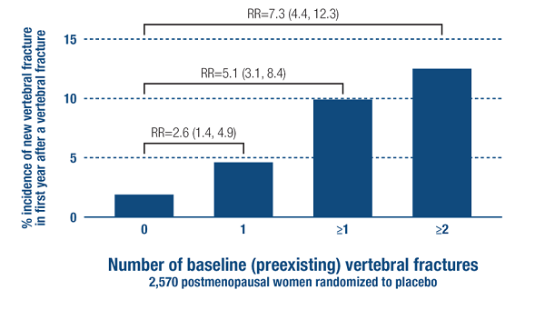 在對北美,歐洲,澳大利亞和新西蘭373個研究中心進行的4項大型3年骨質疏鬆症治療試驗的數據分析中,骨鬆導致在試驗第一年中發生隨後的椎體骨折風險增加2.6倍。具有1個或更多個椎骨骨折分別使該風險增加5倍和7倍 (Lindsay R 2001)。