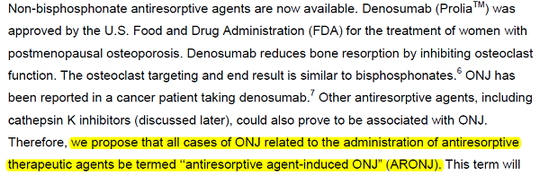 2011年美國牙科guideline指出,骨鬆新發展的藥物中,只要是抑制破骨細胞的抗骨吸收藥品,都已經發現ONJ案例的通報,故也已經把BRONJ拿掉,改為ARONJ (Silverman SL 2009)。