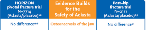 在Aclasta®的臨床試驗中, 共14000病患, 僅在study 2301 中發現, 在研究解盲後發Aclasta®與安慰劑組都各有一位『疑似ONJ』 無統計上顯著意義, 其他臨床試驗中並無通報案例。