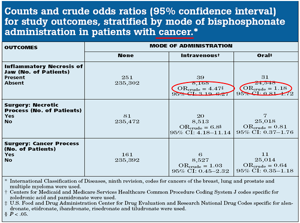 2008年,作者研究了714,217名骨質疏鬆症或癌症患者的醫療索賠數據,以確定三種結果的診斷代碼或程序代碼:頜骨的炎症狀況,包括骨壞死; 主要的頜骨手術需要壞死或炎症適應症; 和頜骨手術需要惡性過程。 作者計算了分層比值比和95%置信區間。 (Cartsos VM 2008 )