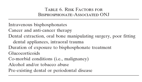ONJ本來就有許多危險因子,包含癌症化療、長期使用類固醇、侵入性牙科手術,病人口腔衛生不佳等等,即使從未使用過雙磷酸鹽類的病人也有可能發生ONJ  (Khosla S 2007)。
