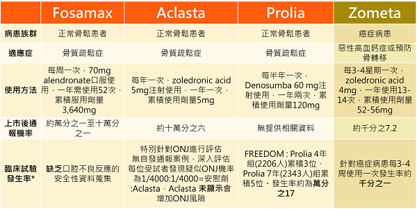 骨鬆患者使用雙磷酸鹽通報有ONJ的案例約為1萬分之一到十萬分之一,生物製劑通報案例約為萬分之17,癌症用藥則因為劑量和使用頻率遠大於骨鬆治療藥物,故發生率遠高於骨鬆治療藥物。