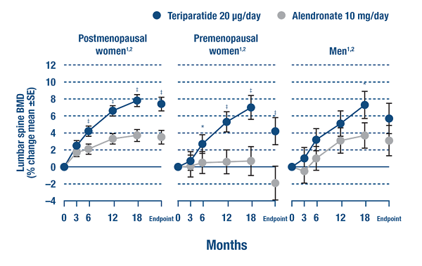 所呈現的數據顯示腰椎BMD的平均百分比從基線增加。在24個月時,絕經前婦女的TPTD組腰椎BMD增加明顯高於ALN組(9.3%vs 5.2%,p <0.001),絕經前女性(8.3%vs 2.6%,p = 0.006) )和男性(10.1%vs 3.9%,p = 0.03)(Dobnig H 2009)。