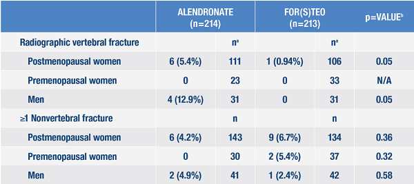 在18個月的初步研究階段後,在男性、絕經前和絕經後GIOP女性中,與ALN相比,接受TPTD治療的患者(絕經後1例)發生放射性診斷椎體骨折(10例;絕經後6例,男性4例)。 兩個治療組中沒有絕經前婦女出現新的椎骨骨折。