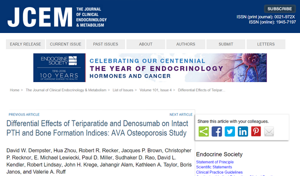 Dempster DW, Z. H., Recker RR, Brown JP, Recknor CP, Lewiecki EM, Miller PD, Rao SD, Kendler DL, Lindsay R, Krege JH, Alam J, Taylor KA, Janos B, Ruff VA, (2016 ). "Differential Effects of Teriparatide and Denosumab on Intact PTH and Bone Formation Indices: AVA Osteoporosis Study." J Clin Endocrinol Metab 101(4): 1353-1363.