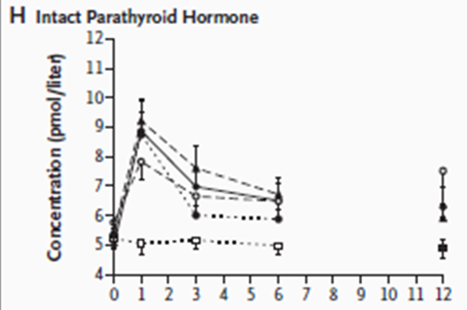 破骨抑制藥物治療第一個月,體內iPTH都是上升的。我們在研究中觀察到的PTH的增加並不是denosumab獨有的,並且可能是破骨抑制藥物類別的一個屬性,因為iPTH也隨著alendronate和zoledronic acid治療而增加。