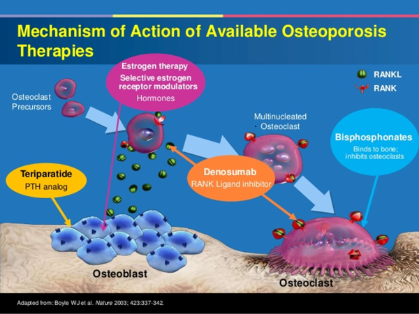 就簡單的說,現在骨質疏鬆症的治療藥物,從一開始的雙磷酸鹽類,常見的有Alendronate(Fosamax® / Fosamax® Plus D,福善美® ;Binosto®,骨密妥®)、Zoledronate(Aclasta®,骨力強®) 、Ibandronate(Bonviva®,骨維壯®)...等,主要是抑制蝕骨細胞、降低骨質流失,達到減少骨折機會的功效。