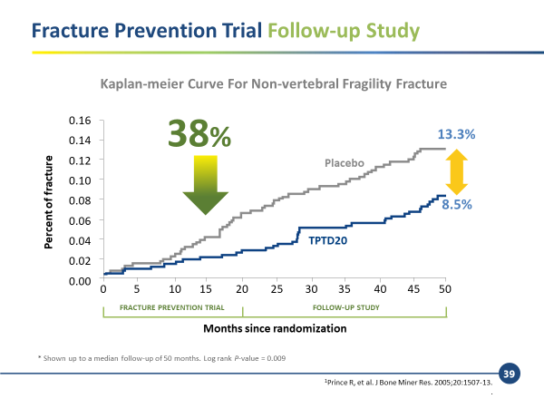 此外,持續追蹤研究更發現,到第 50 個月後,Teriparatide 組患者的非脊椎脆弱性骨折發生率僅 8.5%,較 placebo 的 13.3% 低 38%。證實 TPTD 對重度骨鬆患者的長期療效。