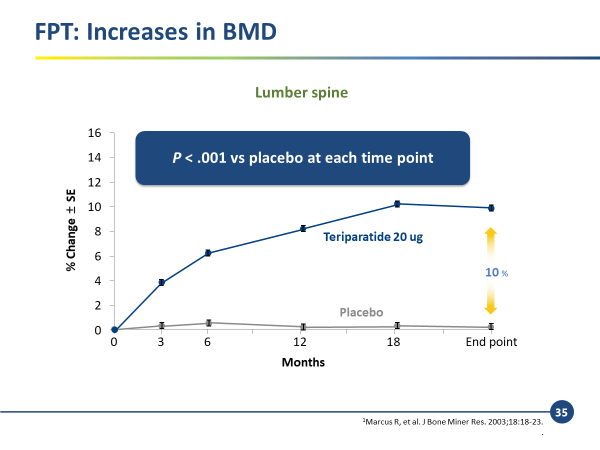至研究結束時,TPTD患者的腰椎骨密度顯著高出 placebo 治療患者 10 %。證實 TPTD確實能有效改善重度骨鬆患者的腰椎骨密度