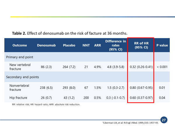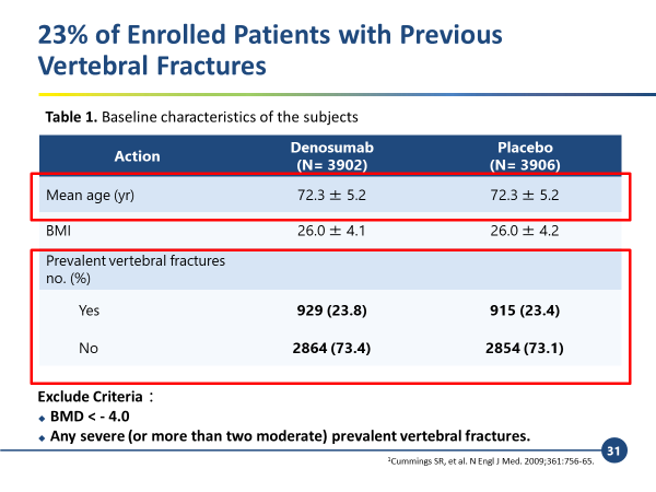 從受試者基線分析中,可以很明顯的看到受試者的平均年齡 64 歲,屬於停經後婦女。整個研究收錄的受試者,只有約 1 / 5 的受試者曾有過脊椎骨折的病史,也就是說,該研究並非以重度骨鬆患者為主,而著重於輕或中度骨質疏鬆症患者