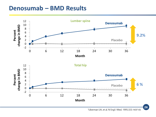 整體而言,FREEDOM 結果顯示,DMab 治療 36 個月後,患者的腰椎 BMD  增加 9.2%,髖骨 BMD 增加  6%。