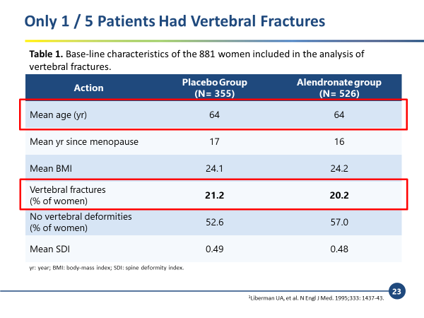 同樣地,其研究納入的對象也並非重度骨質疏鬆症患者,僅約23%患者曾經發生過脊椎骨折。