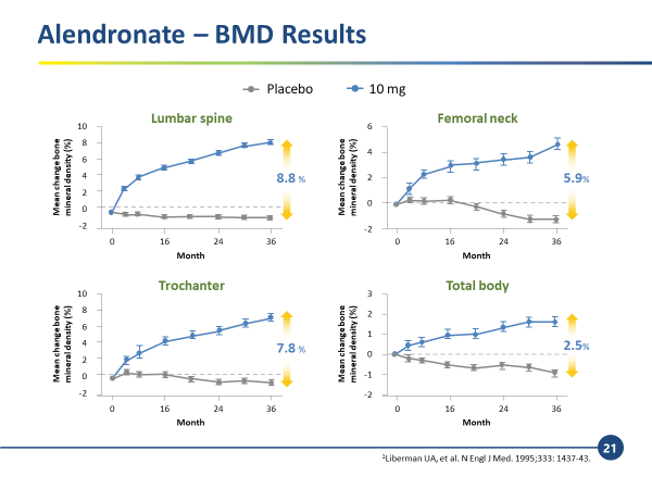 以 10 mg 的 ALN 與安慰劑組相比,不論是腰椎、股骨頸、股骨轉子等處都有5% 以上的改善。特別是腰椎,改善比率趨近9%。代表 10 mg 的 ALN  確實能有效改善患者的 BMD。