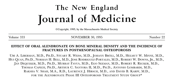 以雙磷酸鹽類的 ALN 為例,Alendronate Phase III Trial 是 1995 Liberman 等人發表在新英格蘭醫學期刊的文獻,探討ALN對停經後婦女骨密度及骨折發生率的影響。