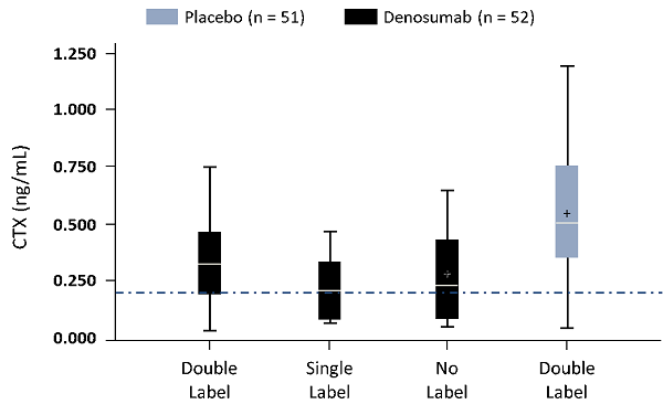 在接受骨活組織檢查的III期關節骨折研究中,DMab治療的女性亞組中,血清CTX水平與骨活檢樣本中沒有沒有單個或雙重四環素標記物相似。