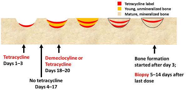 在活檢標本中存在雙重四環素標記(double tetracycline labeling)提供了活性骨重塑(active bone remodeling)的指徵,而沒有四環素標記則表明抑制骨形成。