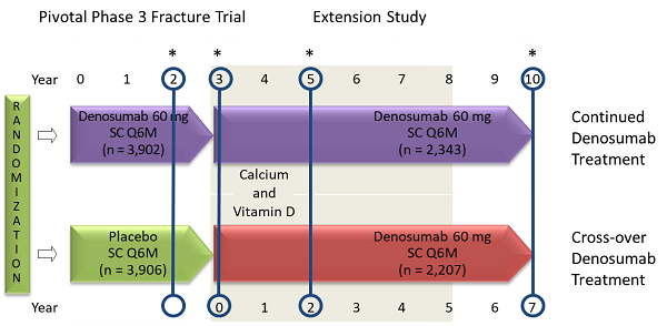 完成關鍵3期骨折試驗(N = 7,808)的4,550例患者入選了7年,國際,多中心,開放標籤的單臂延長研究,以評估DMab的持續安全性和療效