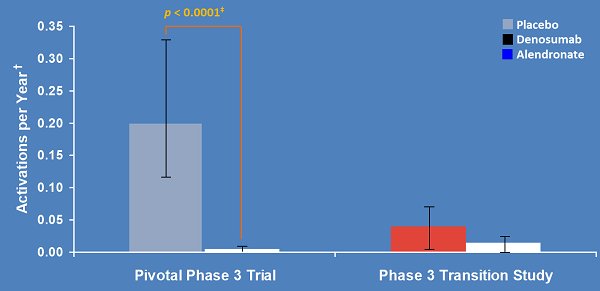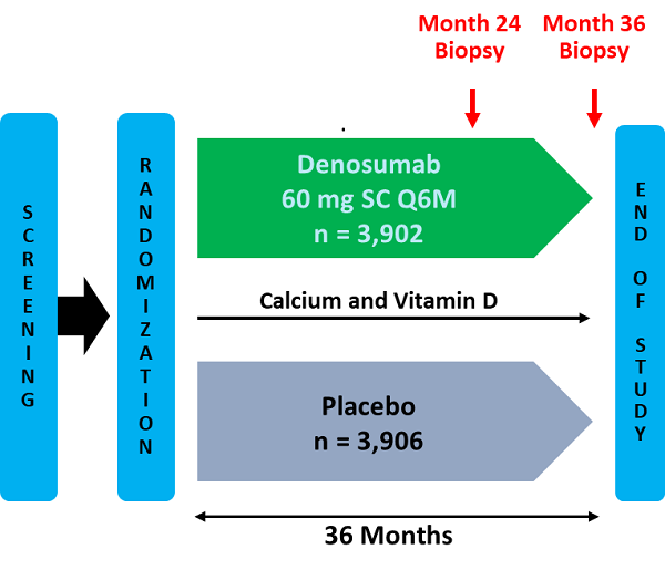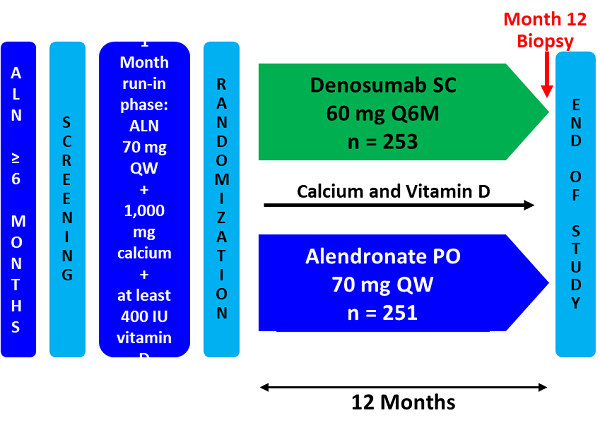 - 患者隨機分配1:1,每週接受SC DMab注射(60 mg Q6M)或ALN(70 mg QW)。 所有患者均接受補充鈣和維生素D。