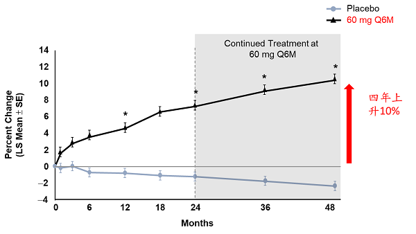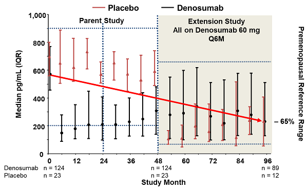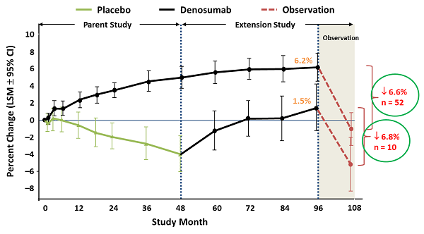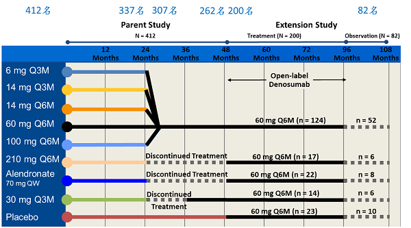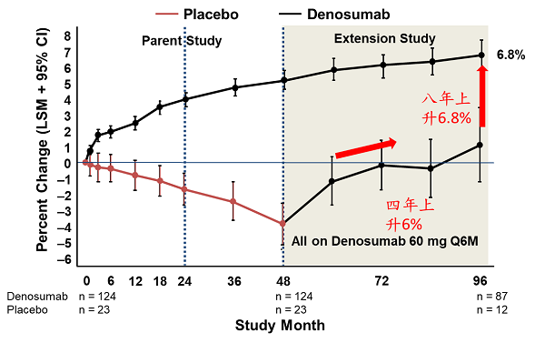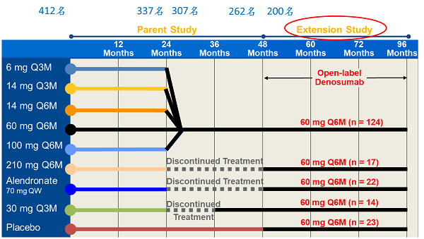 再延伸為八年,母體研究中的基本特徵和延伸研究,參加延伸研究的所有患者中,有96%完成了5-8年 (McClung MR 2013)。