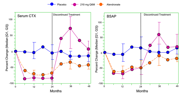 在接受連續性denosumab治療8年的52例患者中,在觀察期間,在停藥後未接受骨質疏鬆症藥物治療(n = 42)的患者的BMD中位數下降幅度高於重新開始denosumab或其他骨質疏鬆症治療的患者。