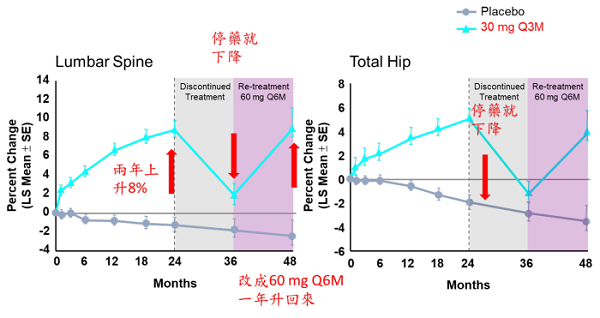 停藥對BMD的影響,停藥BMD就急速下降。改成60 mg Q6M,一年升回來。所以一旦決定用藥就不要任意停藥,停藥可以改成其他藥物,絕對不要任意放棄治療。