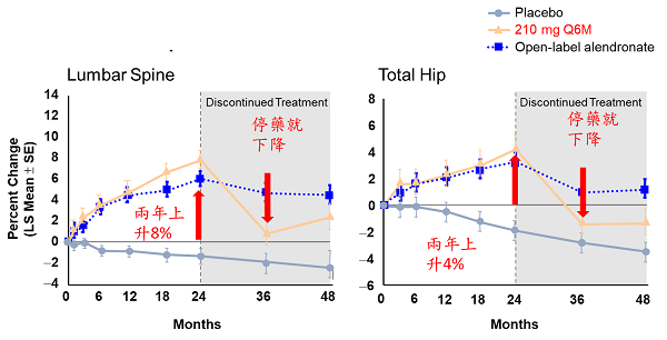 骨質密度在停藥後,一年掉6%(腰椎八年補16%,一年就直接賠6%。髖部八年補6%,一年就直接賠完)。