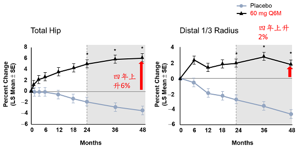 結果四年脊椎BMD上升10%,髖部BMD上升6% ,橈骨BMD上升2%。