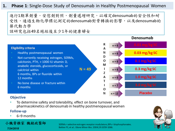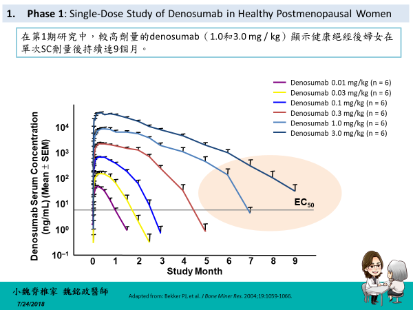 結果,在第1期研究中,較高劑量的denosumab(1.0和3.0 mg / kg)顯示健康絕經後婦女在單次SC劑量後持續達9個月。Denosumab 藥物代謝動力學是劑量非線性的。所以最後採用1.0 mg / kg,一隻設定為60mg,半年打一次。