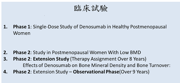 臨床三期研究有DEFEND(Prevention Study)、FREEDOM、DECIDE 、STAND與post-hoc(Transition Study)trails。